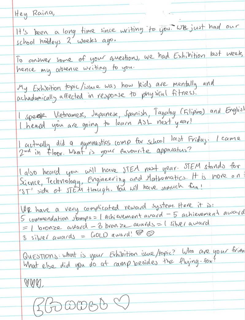 Overall, most students enjoyed the entire process, and all agreed it was a fantastic learning experience. One question that was asked to the students was if they’d ever want to make future pen pals with others. Sophia responded, “I would love to have new pen pals again in the future, since it’s fun and it gave us something to look forward to.” Connecting with ‘pen friends’ is an engaging activity that I would recommend. Our class has gained important knowledge about how to effectively make contact and communicate with new friends so that we can all share our experiences in a fun and interesting way. This has been a unique opportunity to hone our writing skills with a real audience.