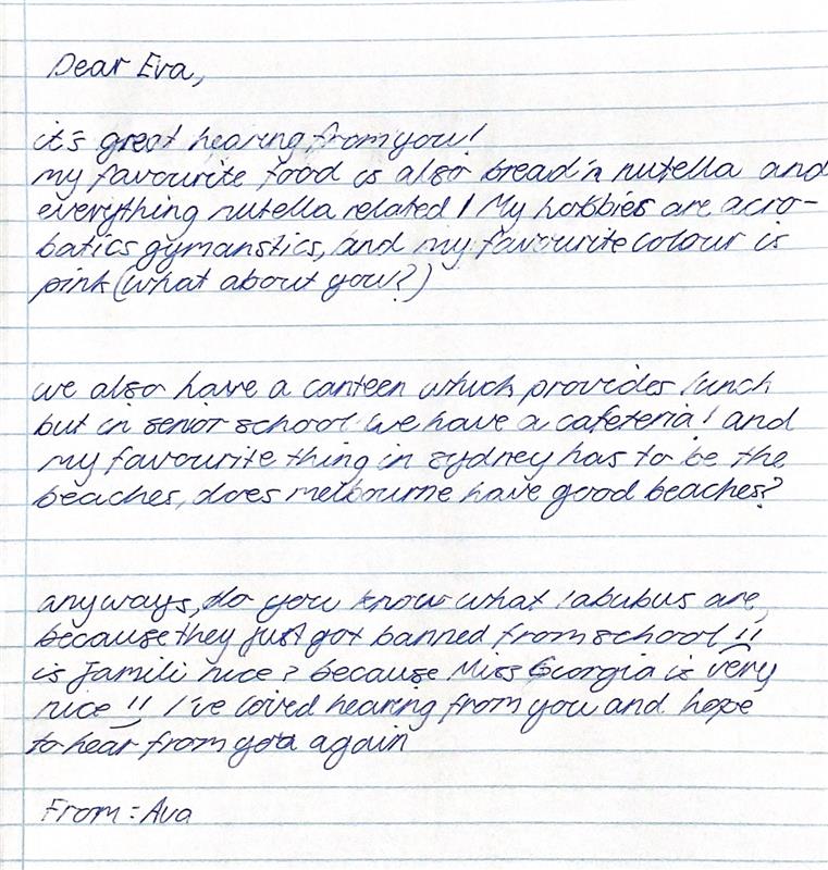 We began by introducing ourselves to the pen pal we were matched with, followed by sharing some background information about ourselves including interests, hobbies, Sydney-slang terms (that are different to those used in Melbourne), school subjects, and some brief information about our friendships and family lives. Of course, we have learned in Year 5 and 6 how to stay safe when communicating with people we don’t know yet, so we knew not to share personal contact information, and Miss Chapman sent our letters for us.